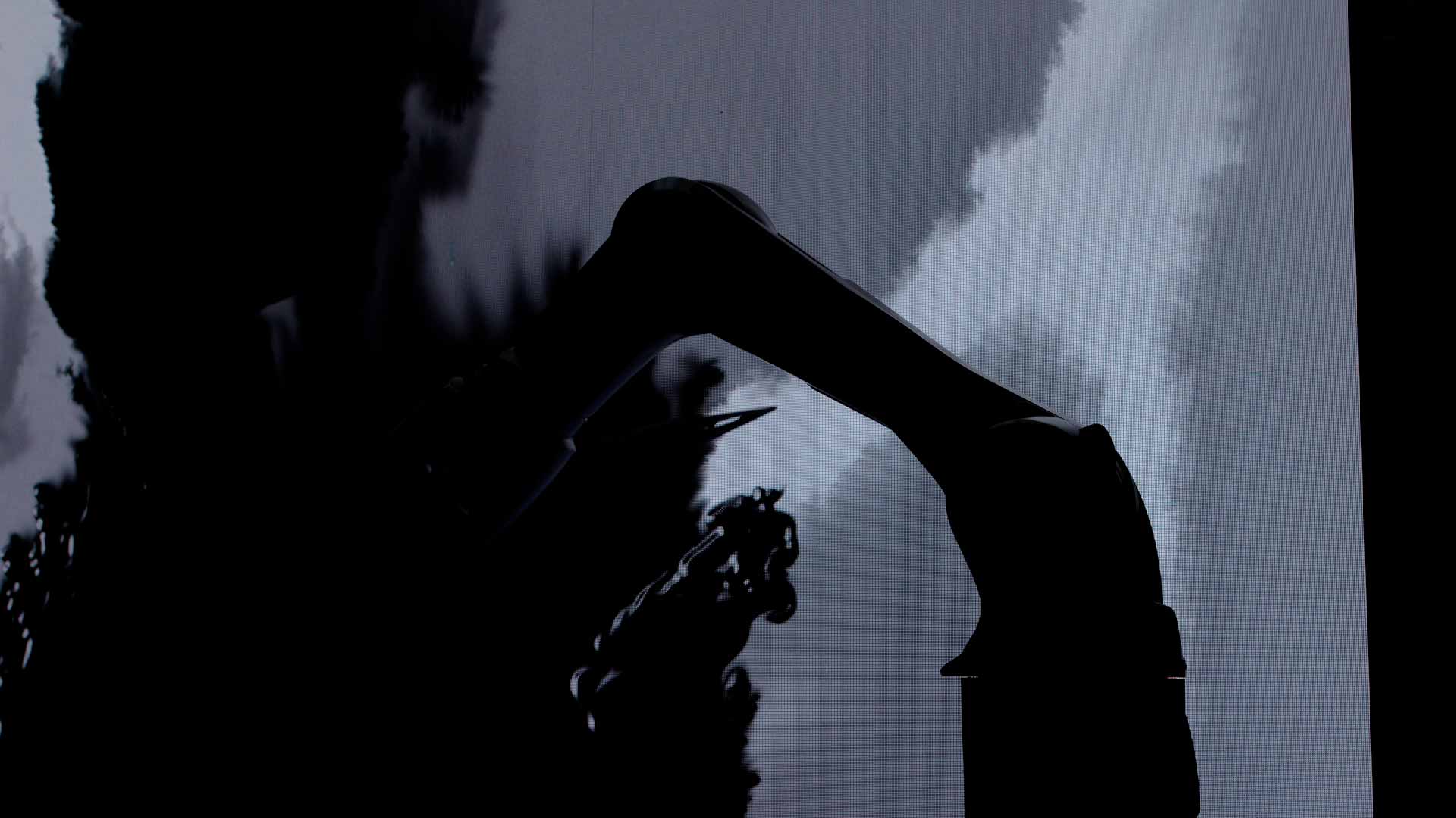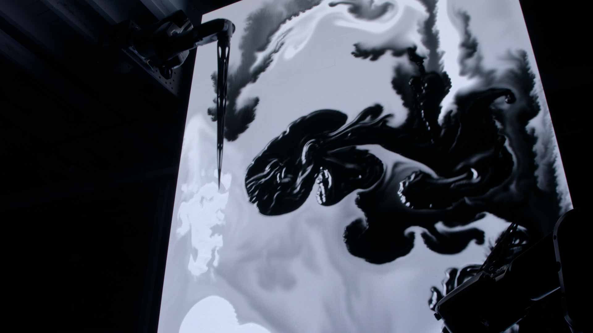 The LED wall surface acts like an invisible membrane between the mechanical and the virtual. It mediates the physical gestures of the robots and the generative content displayed on the pixels behind it. The screen does not merely respond—it evolves in real-time, translating fluid dynamics, pressure, motion, and rhythm into shifting fields of light, color, and form.
