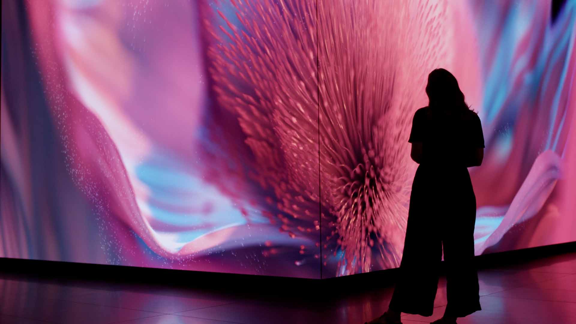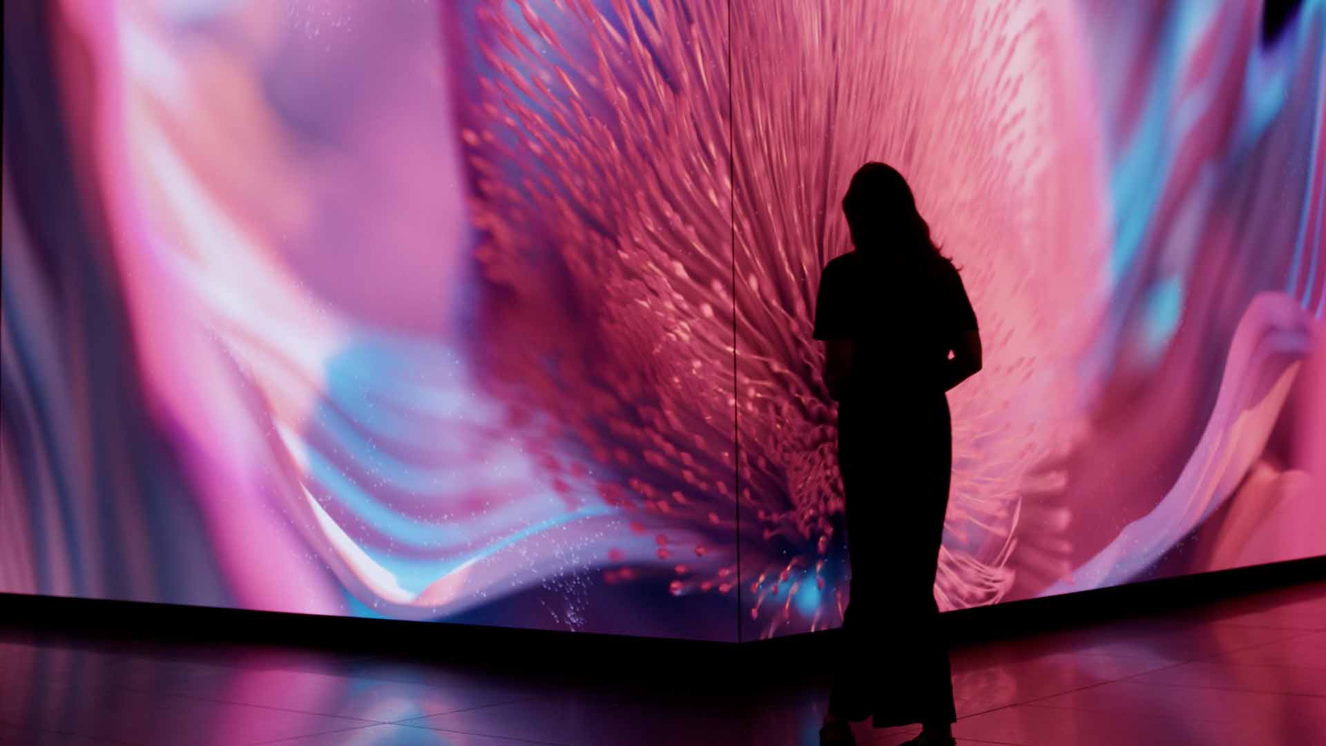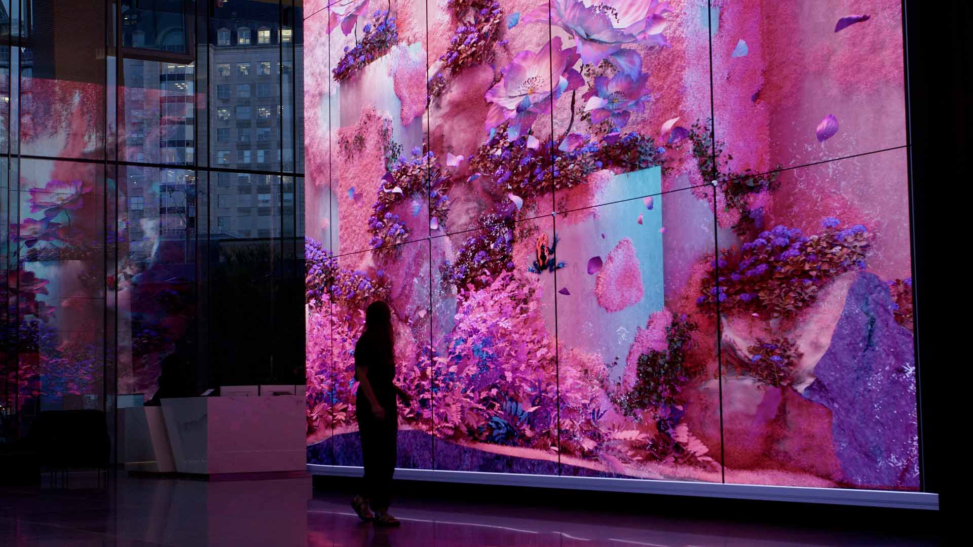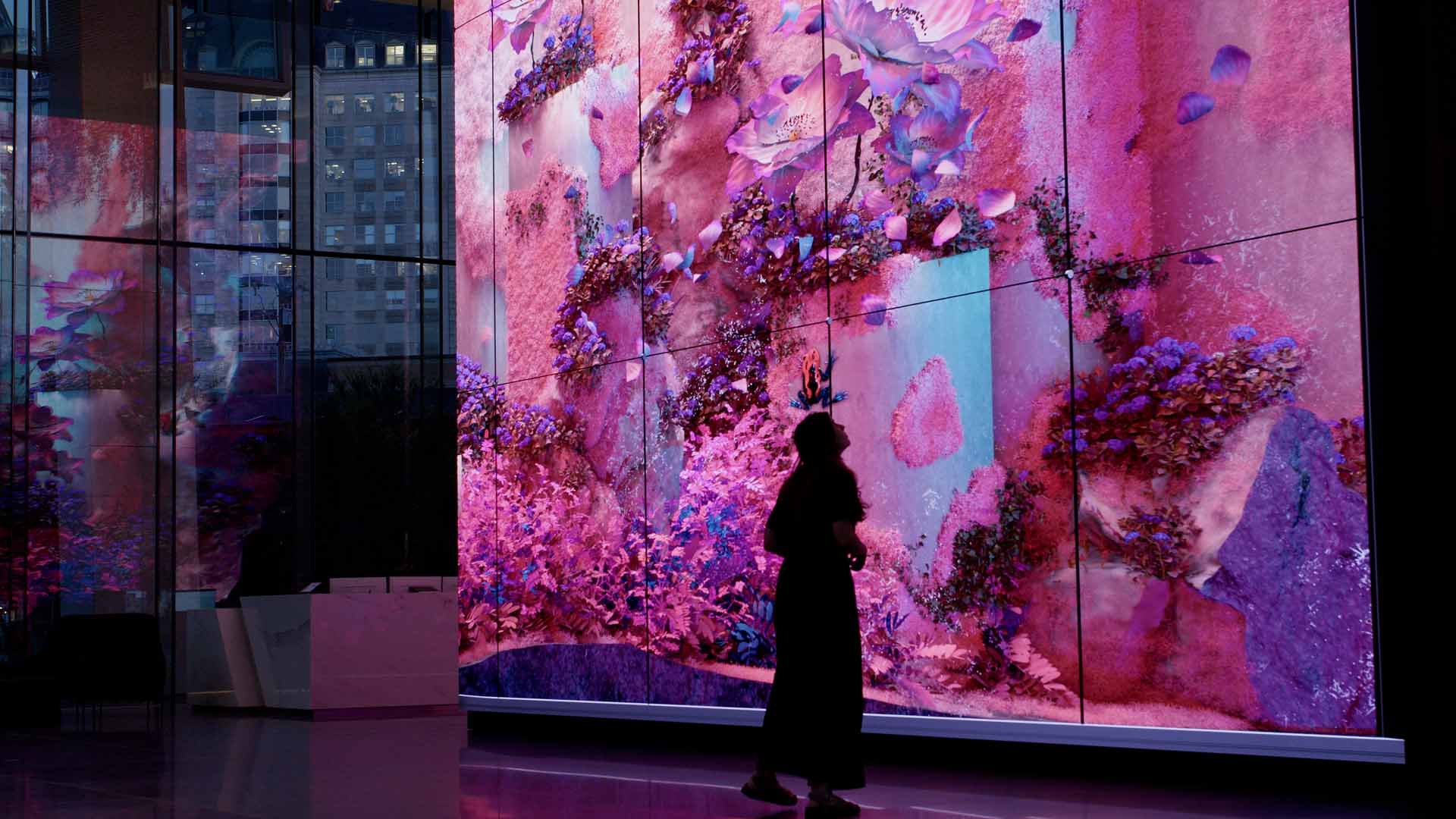 Viewers’ movements send gentle pulses through the habitat, creating new growth, unfurling blossoms, and triggering unexpected bursts of light and motion.