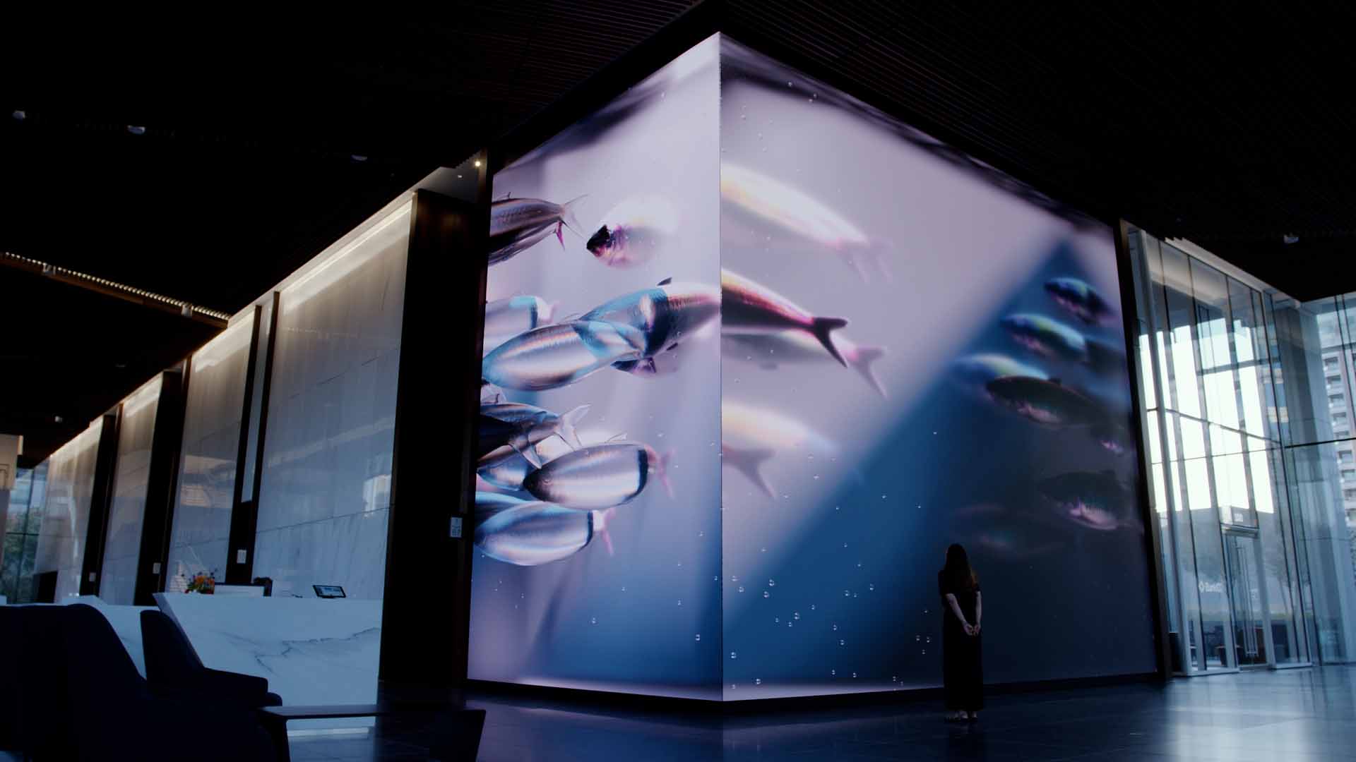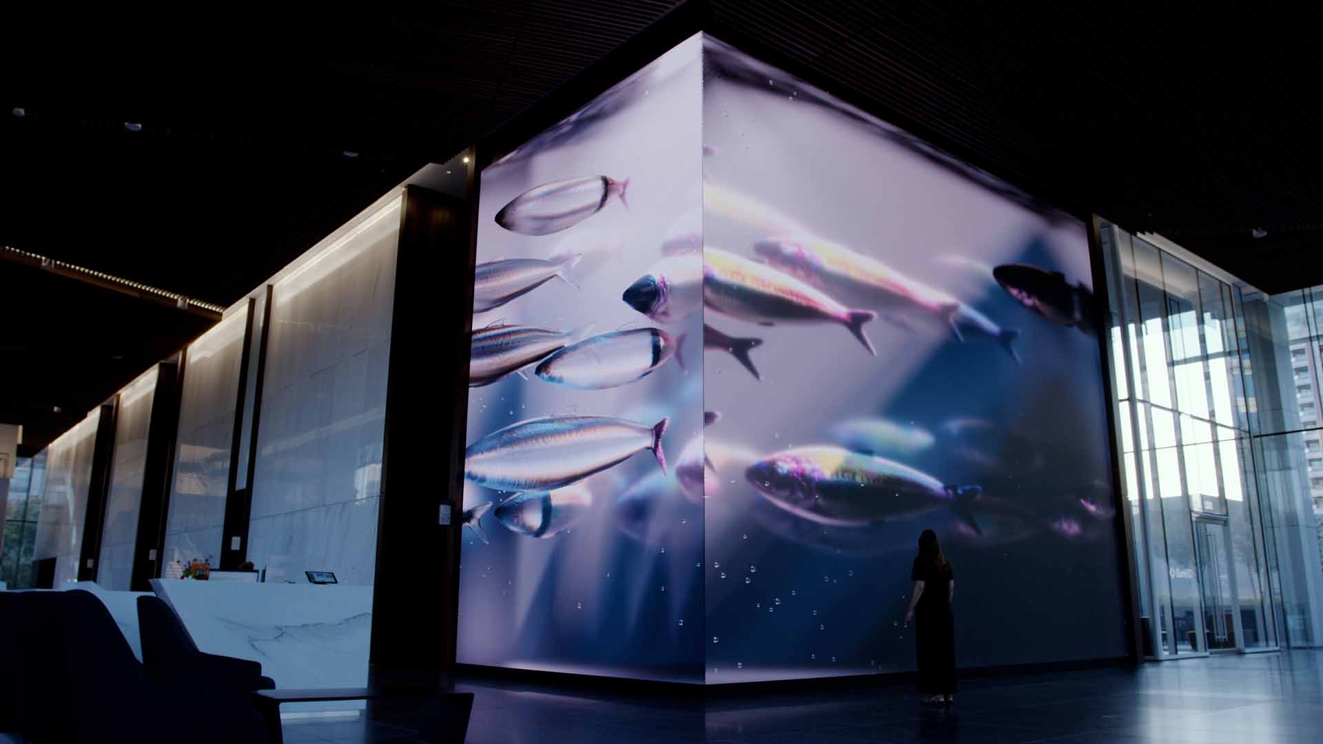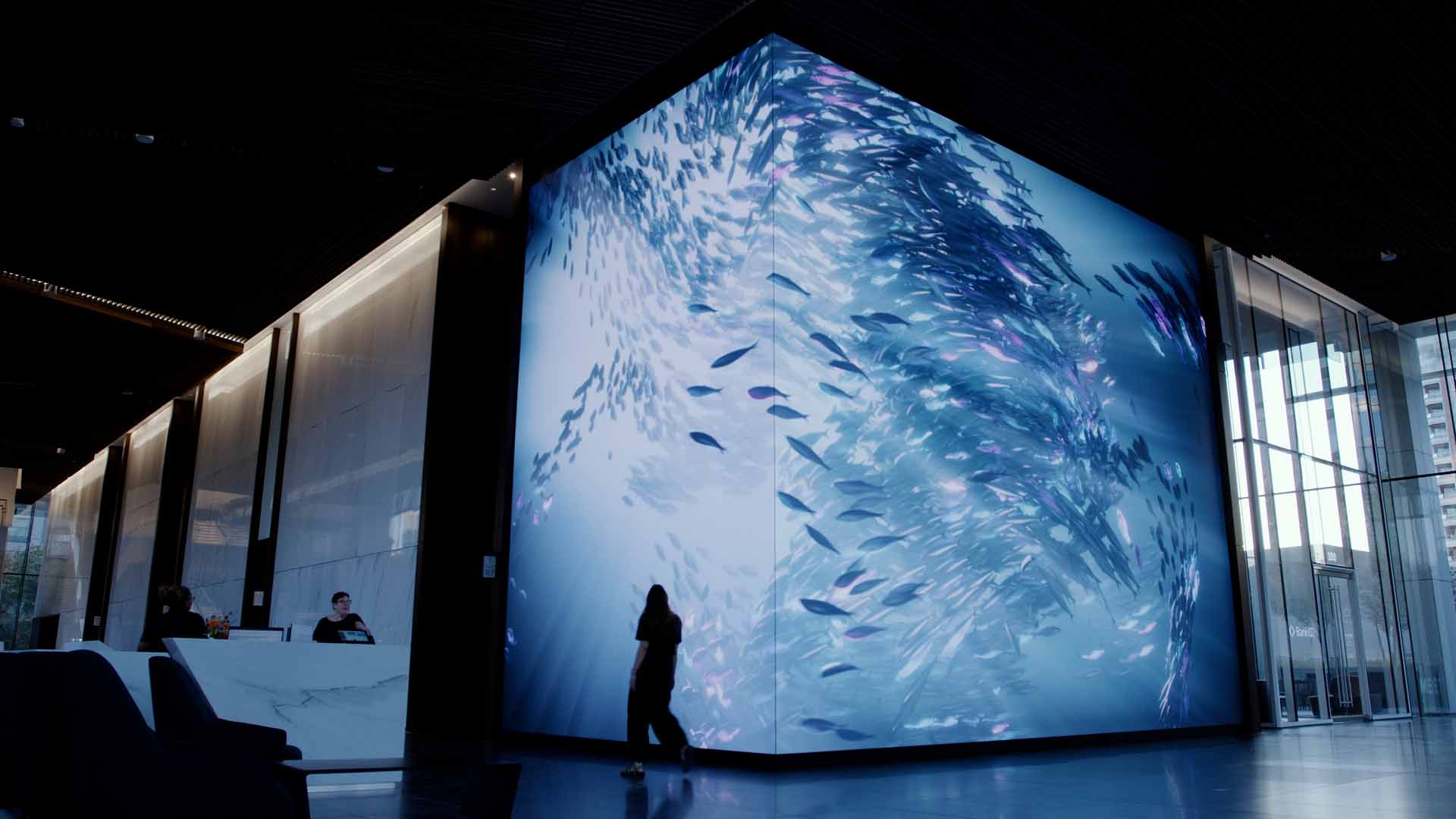 As the scene transitions into Growth, the perspective expands to an open expanse where vast swarms of tarpons move in synchronized waves, their bodies catching flashes of light as they weave in endless patterns. Finally, in Pollinate, the environment transforms into a surreal, anamorphic 3D water tank.